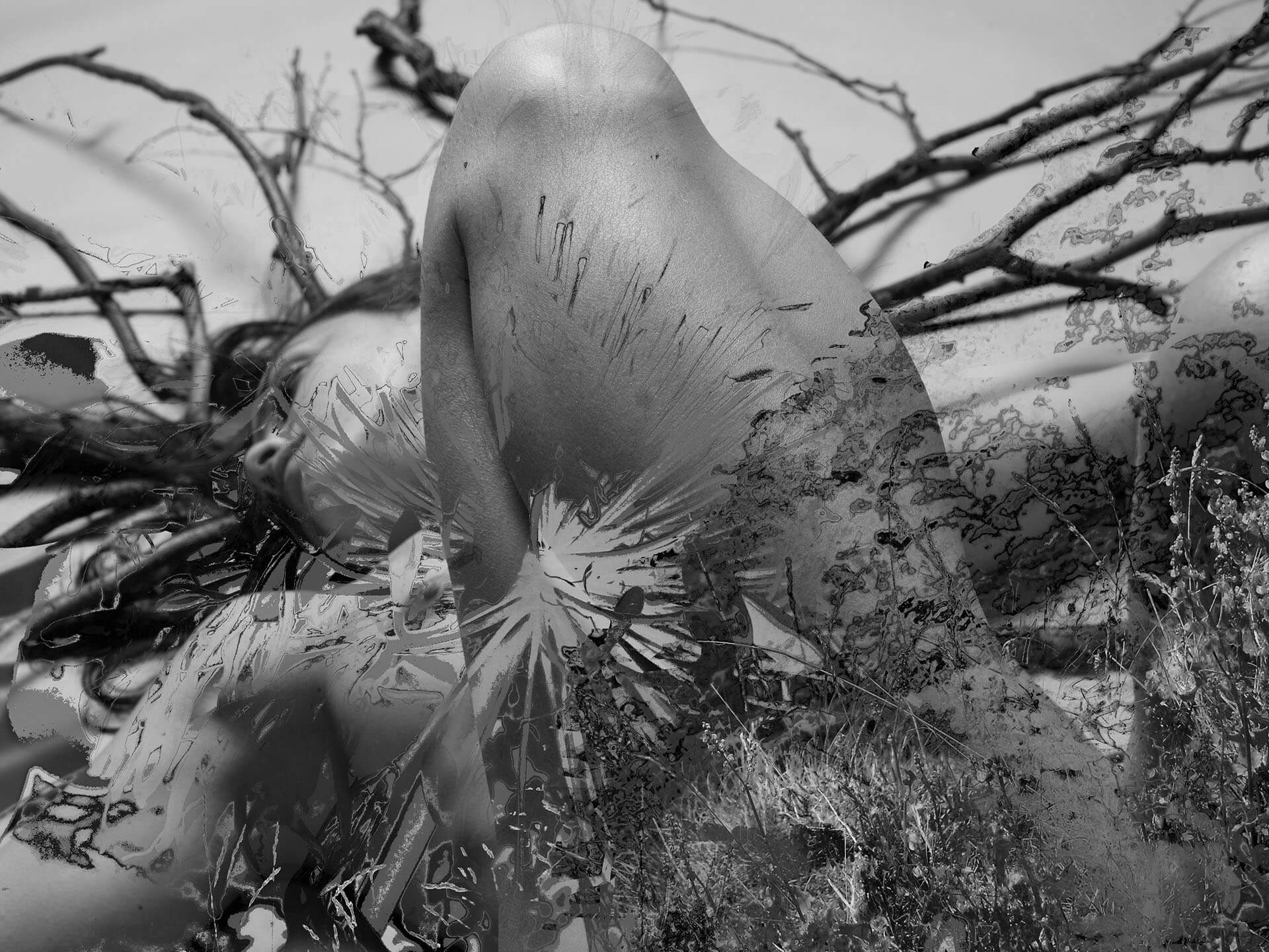 The backgrounds are indeterminate by the black and white. It is time to penetrate secret domains where the body becomes the delicate wick in the middle of the primary elements. Nothing is missing but everything is absence, suggestion. The body feeling itself crumbling of delights crawls, emerges subtly. Gushes, disappears until exhaustion: neither the possible, nor the impossible are still safeguards. All is established in boiling. The hollow where everything begins in a clarity that leads astray but where the shadow reduces the words to silence is experienced.